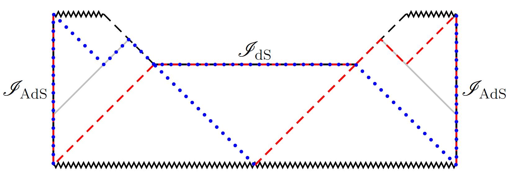 A conformal diagram of an AdS-dS-wormhole. The lack of intersections between the dashed red and dotted blue lines anywhere in the spacetime implies that the HRT conjecture cannot compute the entanglement between the two boundaries.