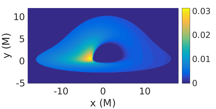 The observed electromagnetic radiation is illustrated here in the simple example of a geometrically thin accretion disk emitting a thermal continuum of radiation with a radially-symmetric flux profile. The figure shows the observed number flux density at 1 keV (per keV, second, and centimeter squared) as a function of the image coordinates (in units of the black-hole mass). The disk image is greatly distorted by all the relativistic effects allowing for a measurement of parameters of the black hole.