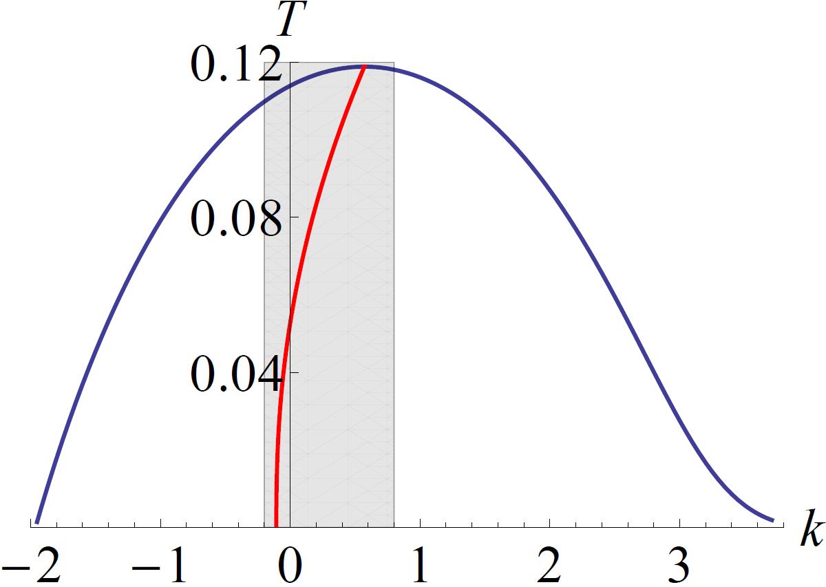 Each point under the blue curve corresponds to a superconducting p-wave black hole with a helical structure at temperature T and with helical pitch 2πk. The red line denotes the thermodynamically preferred black holes which have the smallest free energy at a given temperature. The black holes exhibit a reversal of the direction of the helical pitch at T~ 0.04.