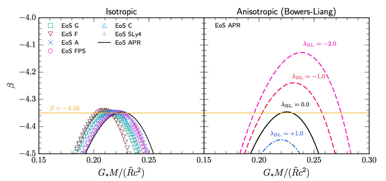 (golden horizontal line), independently of the equation of state. However, if we include anisotropy (right panel), whose strength is controlled by the parameter